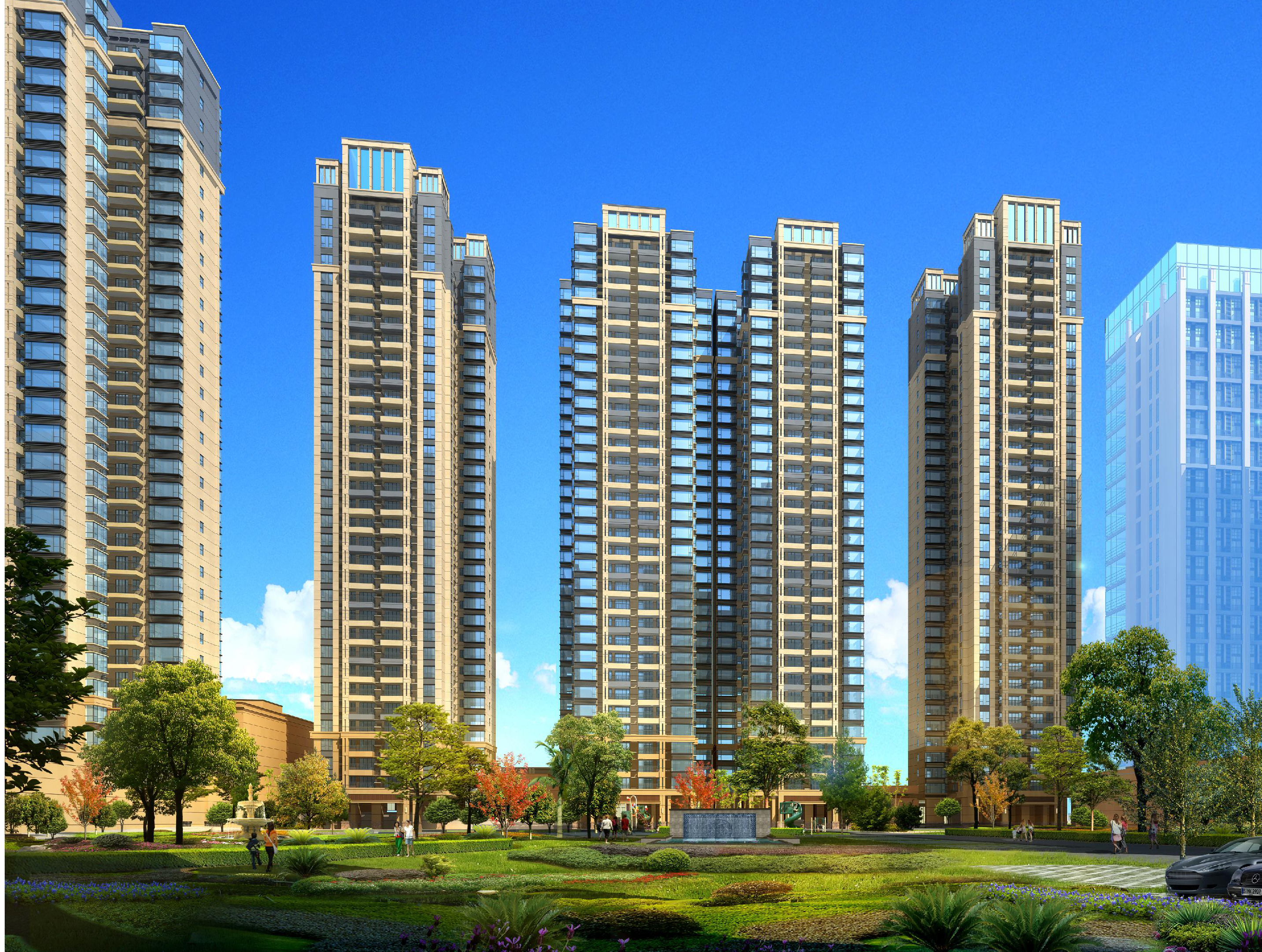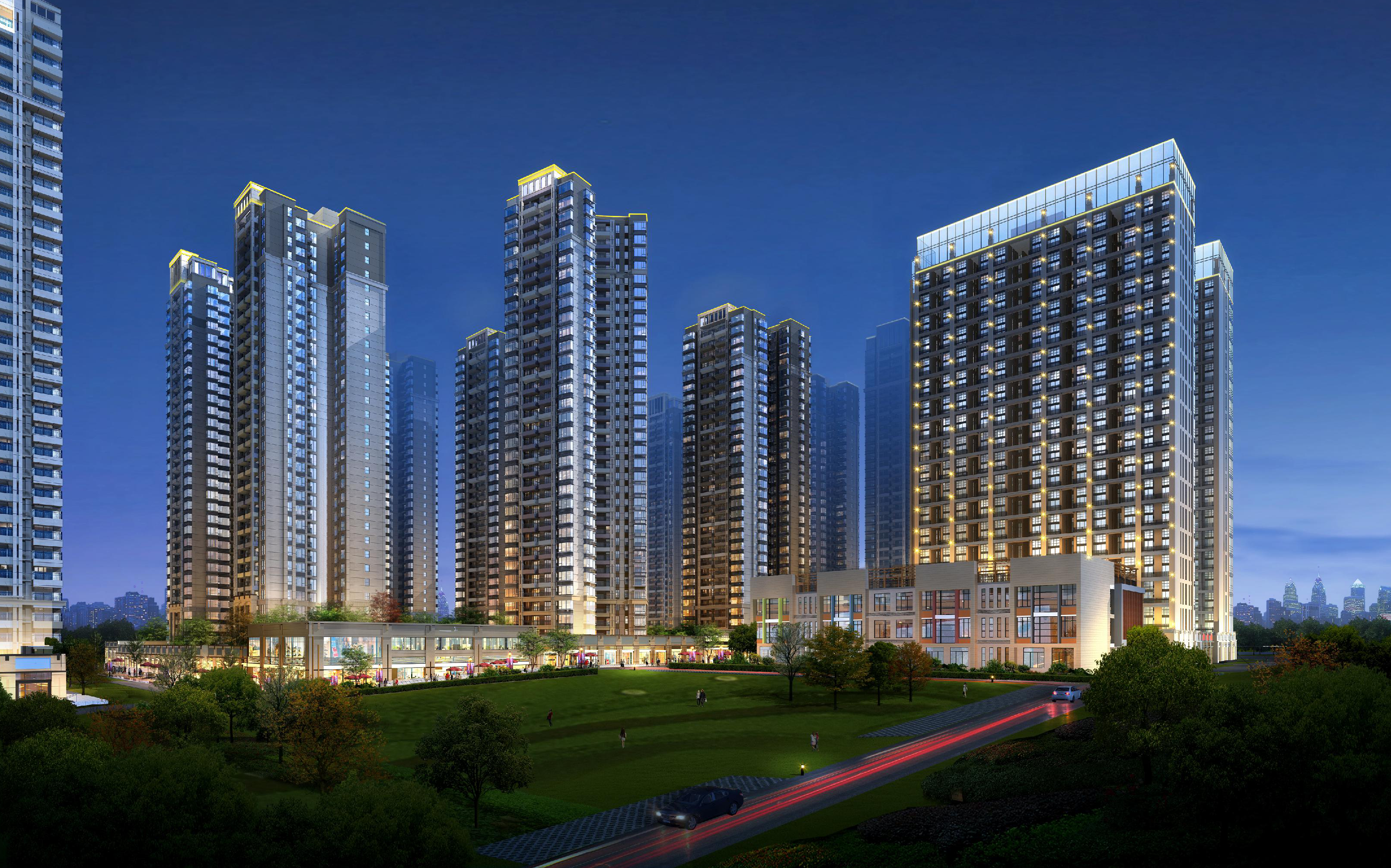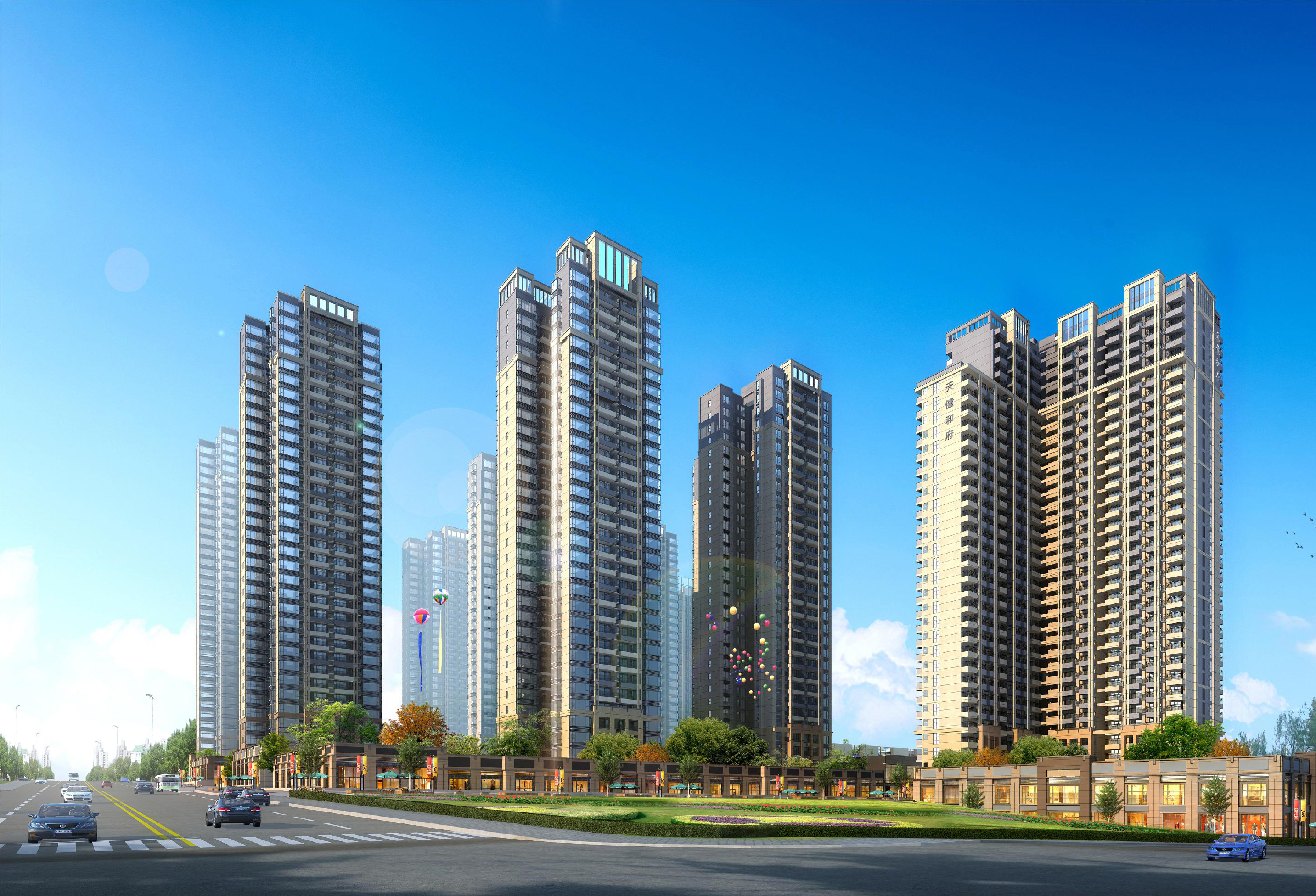 該項目布置為1棟29層、1棟30層、3棟31層、3棟32層、3棟33層住宅樓、2棟高層商業(yè)樓,建筑呈圍合式布置。
