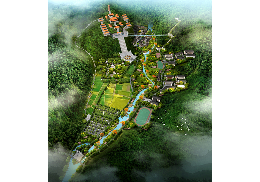 駐馬店忠國寺項目選址位于河南省駐馬店市,距離市區(qū)約50公里,占地面積共約30000畝,總建筑面積約8萬方。用地現(xiàn)狀自然分光、地形地貌獨特,且風水極佳,背有高山、前有流水、位于山谷之中,藏風聚氣。整個項目圍繞忠國寺以“禪行”文化展開設計,規(guī)劃有六大板塊,包含忠國寺寺廟區(qū)、衡水中學駐馬店分校、文武學校、養(yǎng)生素齋館、精品民宿區(qū)、北影影視基地。同時項目含有萬佛大道、景觀索道、玻璃通天橋、聯(lián)姻橋、水上樂園等交通、旅游方面配套設施。