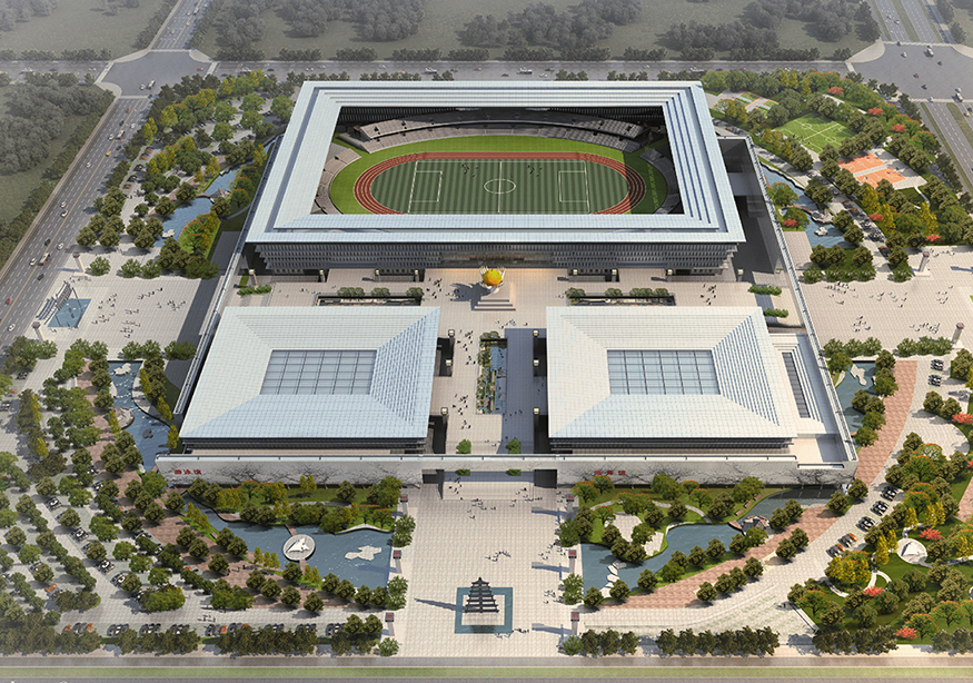 單體,建筑總面積約為62295㎡,包含體育場(chǎng)一座(占地約15100㎡)、體育館一座(占地約5123㎡)、游泳館一座(占地約1158㎡),可以滿足并承接省級(jí)比賽的賽事要求。另約有3015㎡的配套商業(yè)用房,預(yù)留為體育中心建設(shè)停車場(chǎng)、全民健身廣場(chǎng)、公園綠地等服務(wù)設(shè)施和配套設(shè)施。